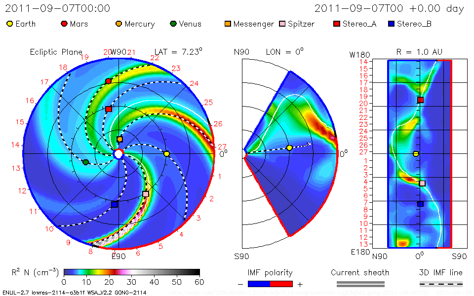 8-го сентября спутник SOHO зарегистрировал на противоположной от Земли поверхности выброс коронарной солнечной массы в направлении Меркурия. Ожидается, что облако выброшенного вещества достигнет планеты 12 сентября в 12UTC (плюс-минус 7 часов). Модель распространения облака приведена на картинке.